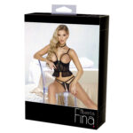 Elegant erotisk string body fra Abierta Fina lavet af sorte blomsterblonder med indvævede guldfarvede metaltråde. Den helt åbne forside holdes kun sammen af 3 dekorative glitterstænger. Der er også glitterelementer foran på de justerbare stropper. I den næsten frie ryg og over den frie bund sørger justerbare strækstropper på guldfarvede ringe for en perfekt pasform. 95% polyamid, 5% metal.