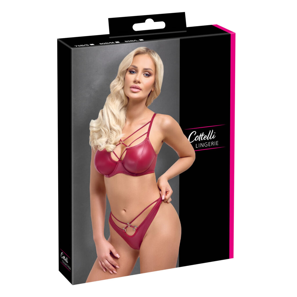 Wet look-stil med ringe og stropper!Sæt med bøjle-bh og g-streng fra Cottelli LINGERIE. Begge i et sofistikeret rødt wetlook – bløde og strækbare for maksimal komfort. Bøjle-bh med elastiske stropper og dekorative sølvfarvede ringe i kavalergangen. Med justerbar hægtelukning bagpå. Stropperne er også justerbare for perfekt pasform. Rio g-streng med dekorative sølvfarvede ringe og elastiske stropper foran i linningen. Høj benudskæring viser numse og ben perfekt frem.90% polyester, 10% elastan.