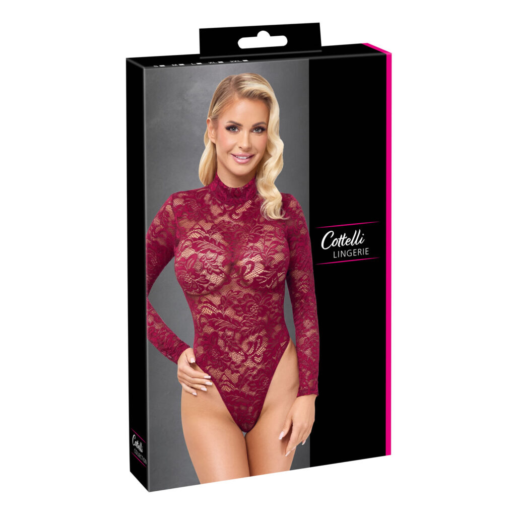 Fine ornamentale blonder i en sofistikeret farve!Langærmet body fra Cottelli LINGERIE med en lille ståkrave. Fremstillet udelukkende af fine pynteblonder i en sofistikeret bordeauxrød farve. Elastisk og blød over det hele for høj komfort. Den ribstrikkede model med ekstra høj benudskæring fremhæver numse og ben på bedste vis. Med trykknaplukning i skridtet – praktisk og forførende på samme tid.90% polyamid, 10% elastan.