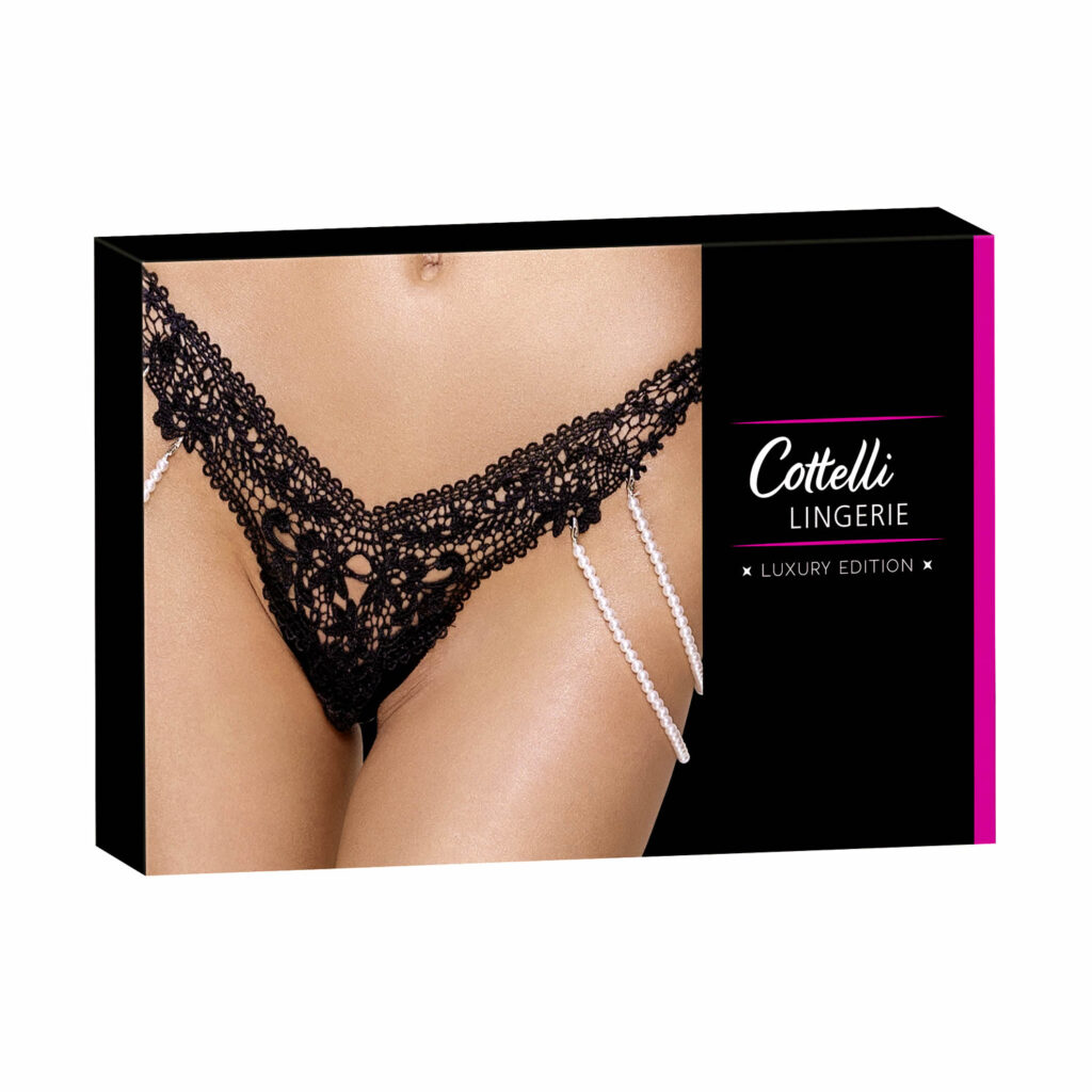 Rio-streng fra Cottelli LINGERIE fremstillet af kostbare broderede blonder (foran) blandet med formstøbt stretchmateriale. Hver side med elastisk dobbelt perlekæde, som begge er helt aftagelige takket være små karabinhager.Broderede blonder 100% polyester