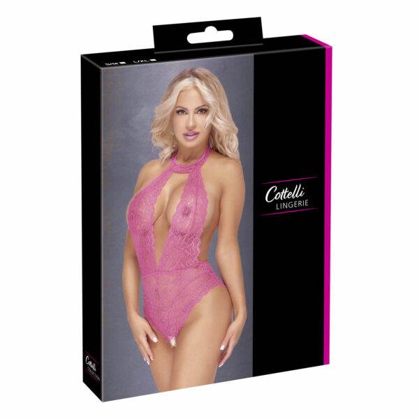 Ouvert krop af Cottelli LINGERIE helt lavet af lyserøde fine blonder. Blød og elastisk for høj bærekomfort. Foran med dyb nøglehulsudskæring under halterneck med blonder. Rygfri, halterneck med spænde i nakken. Helt åben i skridtet op til kroglukningen over bunden. 90% polyamid, 10% elastan.