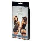 Long sleeve net catsuit Captivate from Fifty Shades of Grey that has a body and stockings in a lace design woven into it. It is very soft and stretchy for a comfortable fit. The front has a plunging neckline and there are exciting cut-outs at the back. The catsuit is completely crotchless and has a foot part. 93% polyamide, 7% spandex.There is a separate size chart for Fifty Shades of Grey. String not included.