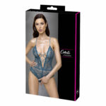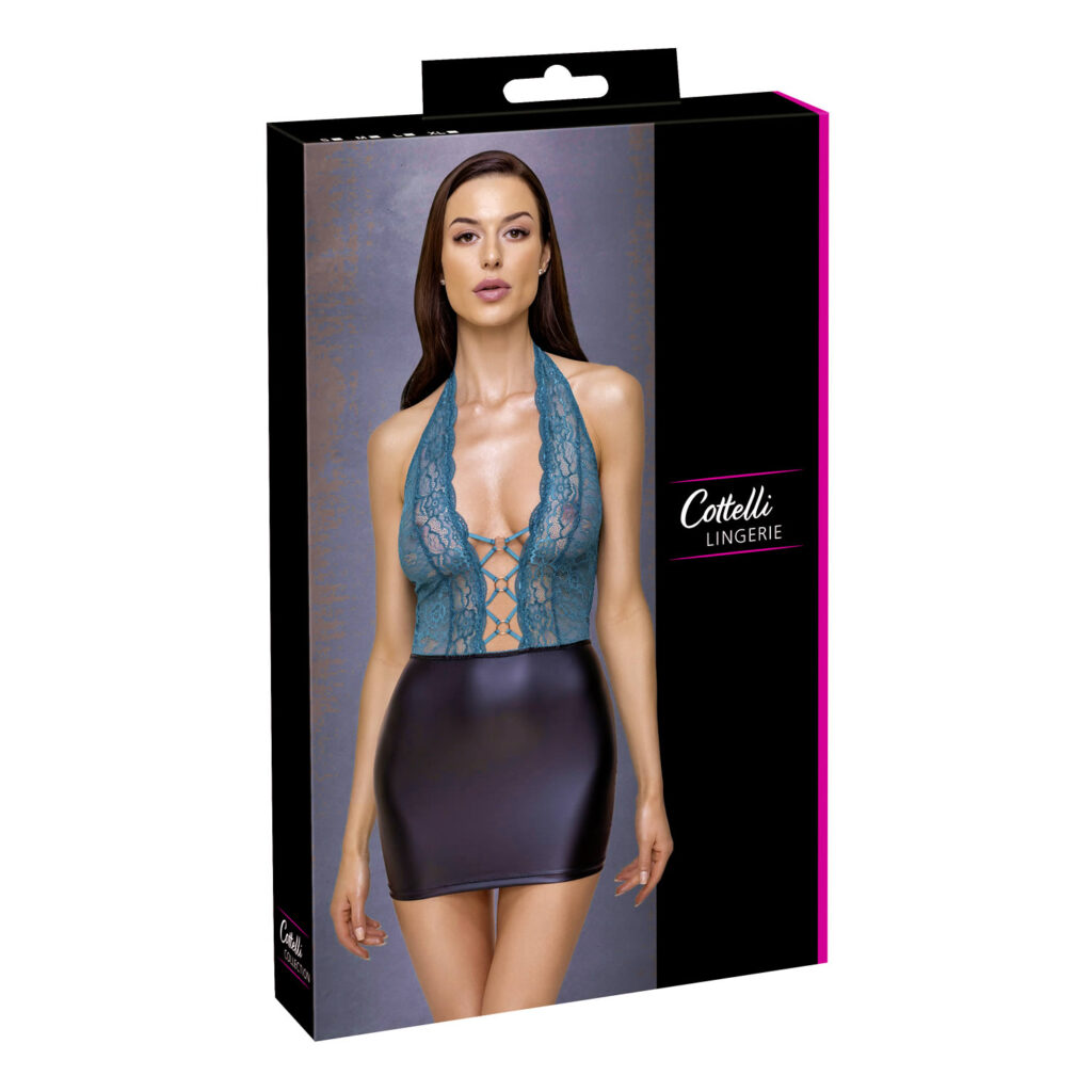 Tætskåret kort kjole fra Cotelli LINGERIE i todelt look med overdel af dine petroleumsfarvede blonder og nederdel i ædelt sort matlook. Dyb udskæring op til navlen – 3 rosaguldfarvede ringe og stretchbånd holder det hele sammen. Nakkeholderen er rygløs og har en klipslukning. 90% polyamid, 10% elastan.