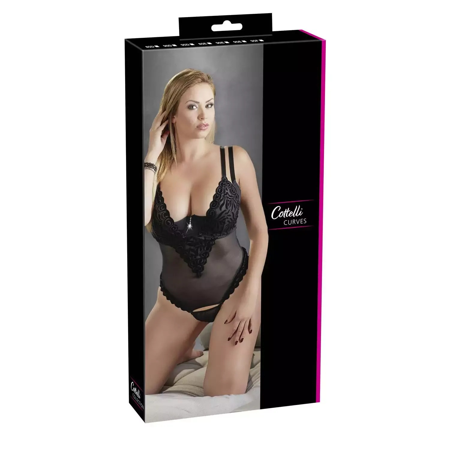 Skin-tight body with long sleeves, a small stand-up collar and a short zip at the back. There is a white zip over the crotch that is extremely eye-catching and very inviting… Black. Very stretchy power wetlook. 80% polyamide, 20% elastane. IMPORTANT: there is a separate size chart for NOIR!