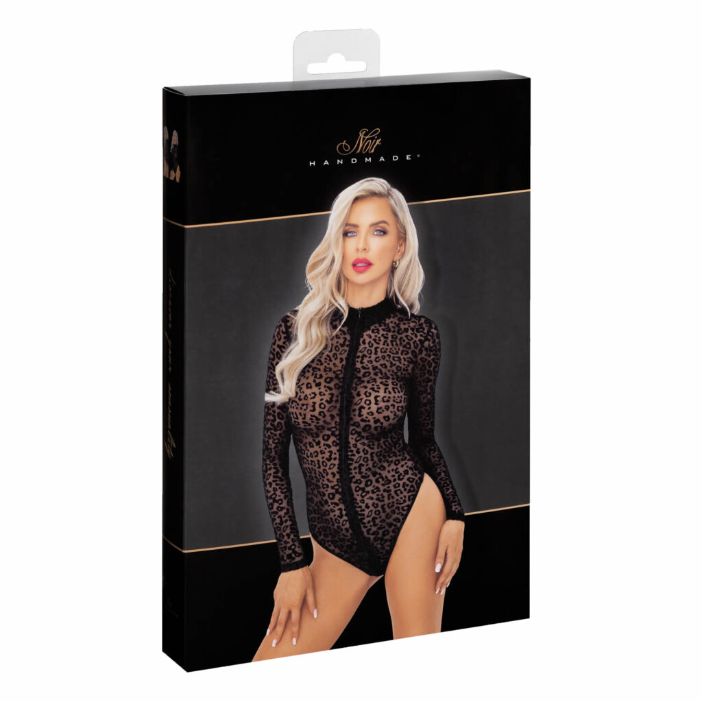 Langærmet body fra Noir helt fremstillet af blødt elastisk powernet med fint fløjlsprint i leopard-look. Den praktiske, erotiske 3-vejs lynlås går fra den oprejste krave ned til skridtet. De høje benudskæringer viser numsen og benene frem på en spændende måde. 90% polyester, 10% elastan.Der findes en separat størrelsestabel for Noir.