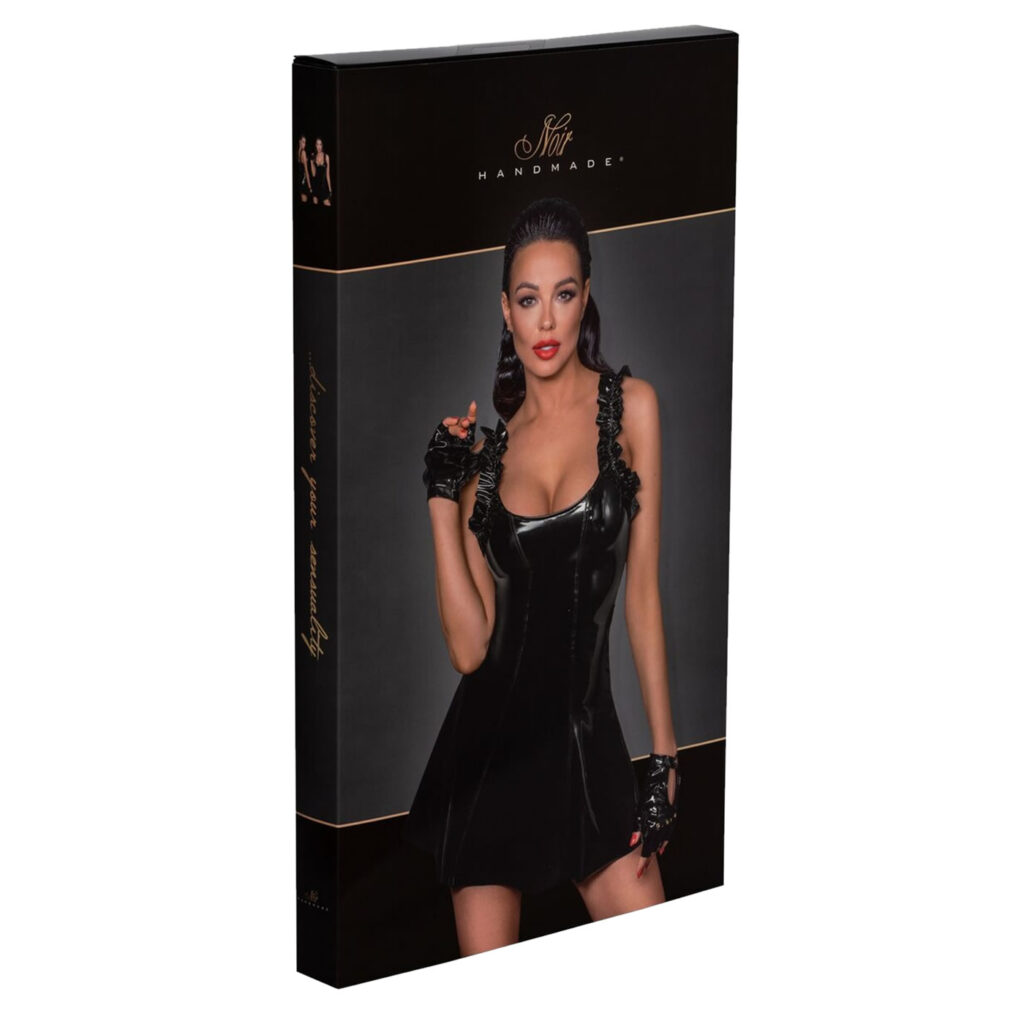 Skinnende sort vinyl kysser søde flæser – sikke en provokerende kontrast. Ligesom den figursyede top og det svungne skørt. Alt i alt en forførende lille kjole til mange lejligheder! Og nem og hurtig at tage af og på takket være den praktiske lynlås bagpå. · Snit og materiale: Kort kjole med sort lakglans og flæsestropper. Figursyet snit med let udsvunget skørt. Gennemgående 2-vejs lynlås på ryggen.77% polyester, 23% elastan, polymerbelægning.· Med elastan: denne minikjole ser ikke kun uimodståelig ud, men giver også en sikker pasform og maksimal komfort.· Leveringsomfang: 1 x vinylkjole fra Noir. OBS: Denne vare er mindre end normalt – se venligst den separate Noir-størrelsestabel!
