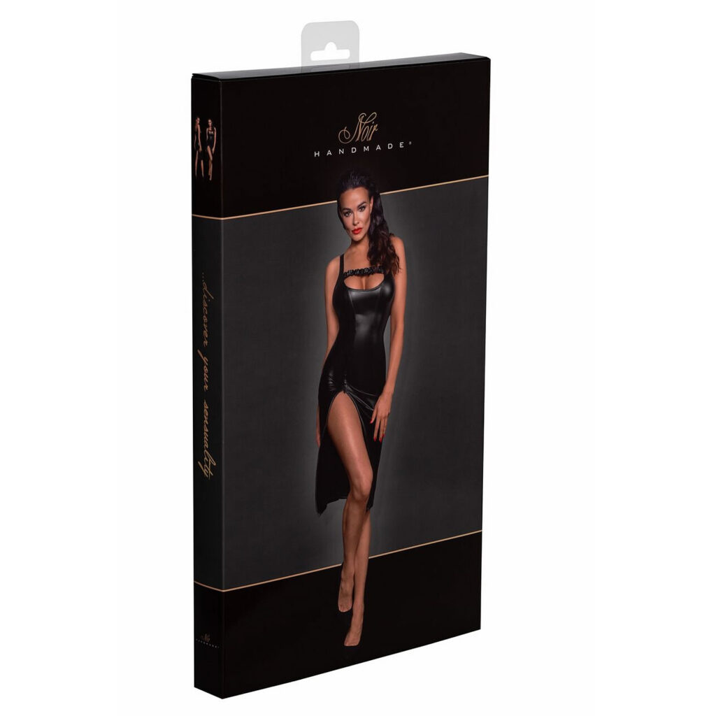· Snit & materiale: Kjole i knælængde. Tætsiddende, figursyet snit i et powerwetlook. Nedringet foran og bagpå, flæsebånd i halsudskæringen. Lynlås foran i siden, som kan åbnes op til låret. Ekstra slids bagpå. 76% polyester, 24% elastan, polymerbelægning.· Blød og elastisk: Denne behagelige kjole ser ikke kun uimodståelig ud, men giver også maksimal komfort og bevægelsesfrihed.· Leveringsomfang: 1 x kjole fra Noir. OBS: Denne vare er mindre end normalt – se venligst den separate Noir-størrelsestabel! Hvad er så specielt ved denne kjole?Denne elegante sorte midikjole i et skinnende mat powerwetlook smyger sig om dine kurver. Den stroppede styling med et rynket bånd ved den dybe halsudskæring understreger dit forførende look. Du kan også åbne lynlåsen foran op til låret og vise en sexet mængde ben frem. Den vandrende slids bagpå og det elastiske, bløde og behagelige materiale giver dig masser af plads til at bevæge dig og endda turde danse lidt vildt.