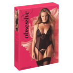 Erotisk elegant tiltrækningskraft!Sort 3-delt sæt Donarella by Obsessive med babydoll, g-streng og choker. Fremstillet af fin stretch-tyl med detaljerede broderiindsatser. Blød og elastisk over det hele for høj bærekomfort. Udspilet babydoll med lav udskæring og broderede skåle. Det lille smykkeelement mellem skålene fanger øjet. Hægtelukningen bagpå og stropperne er justerbare. Snoren forfører foran og bagpå med delikate broderiindsatser. Den justerbare, tætsiddende krave fuldender det erotiske, elegante look!94% polyamid, 6% elastan