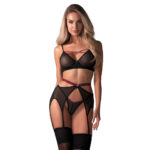 Sophisticated transparent material!The 2-piece suspender set, Novenes from Obsessive, has a basque and thong. Everything is made out of delicate black powernet with pink strap accentuation. There are straps over the cleavage area and a beautiful rhinestone element between the wireless cups. The bra and suspender straps can be adjusted to fit. The basque also has a hook fastener at the back as well. The small thong adds the finishing touch to this elegant, transparent set.94% polyamide, 6% spandex.Without stockings.Important – there is a separate size chart for Obsessive.
