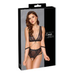 Nøgne fakta iscenesat på fængslende vis!Åben sæt fra Cottelli BONDAGE med en barmende top, skridtløse trusser og to bløde håndjern. Stilfuld blanding af fine sorte blonder med mørklilla matte lookdetaljer og sølvfarvet tilbehør. Toppen indrammer de bare bryster med kæder. Taljebæltet på den forreste ring kan justeres med trykknapper, og det samme kan stropperne. Justerbar hægtelukning bagpå. Trusser med aftagelig, stimulerende kæde i det åbne skridt. Justerbar linning med trykknapper. Manchetterne kan hægtes fast i sideringene på linningen med deres karabinhager. De bløde ankelmanchetter kan hurtigt tages af og på med de justerbare velcrolukninger.90% polyamid, 10% elastan.