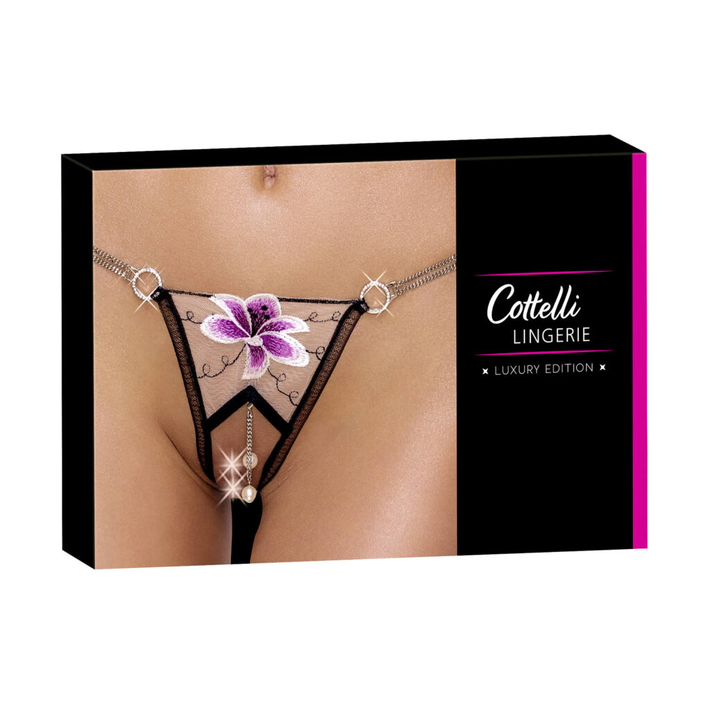 Cottelli LINGERIE’s skridtløse g-streng af fint tylnet med en smuk blomst og delikat broderi på den forførende åbne front. 2 svingende små kæder med perler pynter og stimulerer – men er også helt aftagelige. Stretch linning foran med 2 rhinestone kæder og ring i hver side. Elastisk Powernet-indsats bagpå for en sikker pasform. 100% polyamid