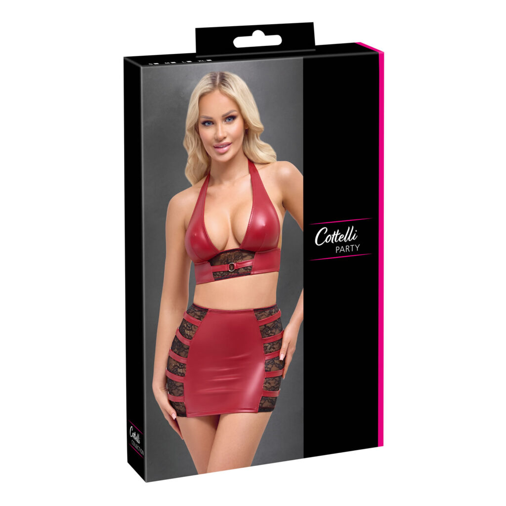 Stilfuldt wetlook blandet med blonder!Mavefri halterneck-top og tætsiddende mininederdel fra Cottelli PARTY. Begge i et sofistikeret rødt wetlook med sorte blondeindsatser og stilfulde stropper med sølvfarvede ringe på toppen. Bløde og elastiske over det hele for maksimal komfort. Rygløs top med halterneck med trykknapper og blondeindsats foran. Kort nederdel med blondeindsatser prydet med stropper i siderne.85% polyester, 15% elastan
