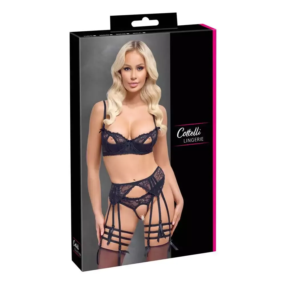 Fængslende stil med komfort!Spændende sæt fra Cottelli BONDAGE med en blød bh, skridtløse trusser med strømpeholder og to bløde håndtag. Elegant rødt, mat look, der fremhæves stilfuldt med sølvfarvede (bondage)ringe og tilbehør. Blød og elastisk over det hele for høj bærekomfort. Bh med ring mellem de bløde skåle. Stropperne og hægtelukningen bagpå kan justeres, så de passer. Trusser med seler, høj talje og justerbar hægtelukning bagpå. Aftagelig, stimulerende kæde i det helt åbne skridt – op til over numsen. Strømpeholderne og lårstropperne kan justeres, så de passer. Manchetterne kan hægtes på de mange ringe med deres karabinhager. De bløde ankelmanchetter kan hurtigt tages af og på med de justerbare velcrolukninger.85% polyester, 15% elastan.